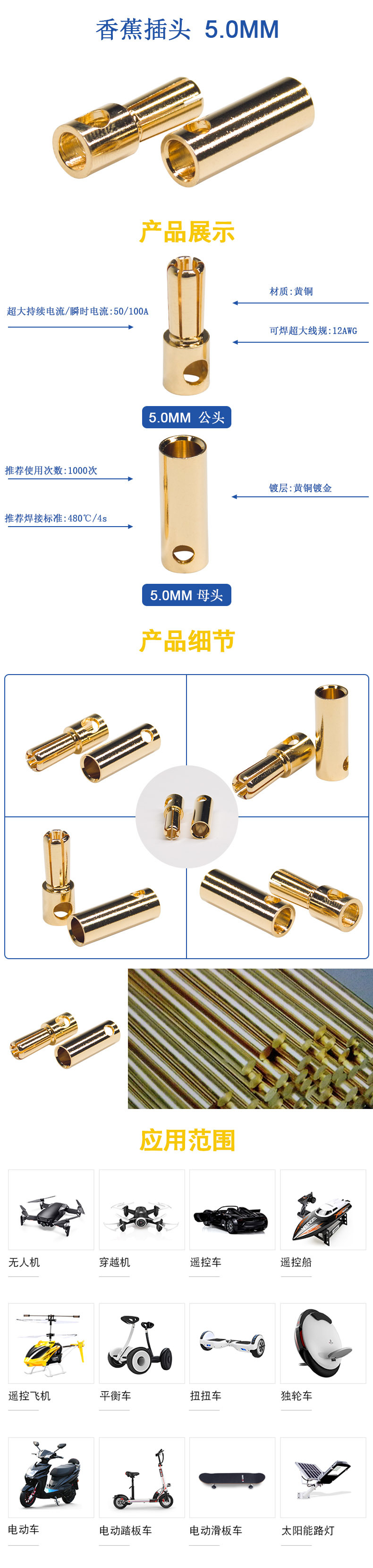 采用A级黄铜国际标准铜材生产,插头镀金,起到很好的保护作用,防止氧化,有效地延长了插头的使用寿命,拥有良好的导电性,持续稳定,产品广泛使用于各种电子电机,工业机器,电动航模,航模、车模,船模,电池电调,无人模,扭扭车、医 疗 器 材,仪表仪器等领域。